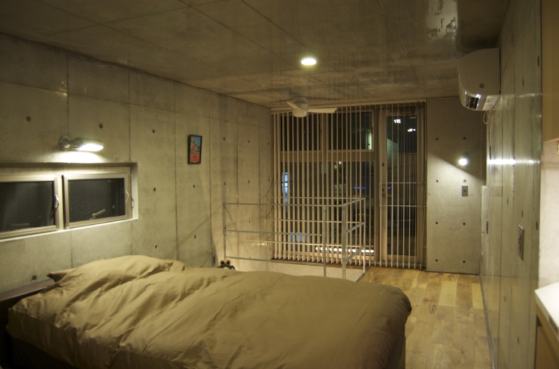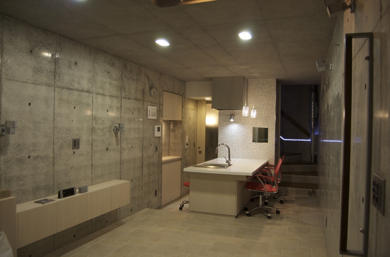 住宅密集地に建つ、敷地面積約10坪、建坪約6坪の狭小住宅。外部からの視線を遮る高い壁と、吹抜けなどの工夫で小さいながらも、内部は開放的に。